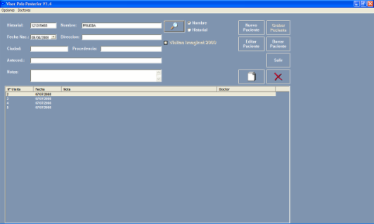 b. Pantalla de datos de Paciente. En esta pantalla tendremos los datos de filiación del paciente y sus visitas. También podremos agregar un nuevo paciente presionando el botón Nuevo Paciente, modificar un paciente con el botón Editar Paciente, borrar un paciente con el botón Borrar Paciente, ver una visita dando doble clic sobre ella o dar una nueva visita presionando el botón con las hojas en blanco.