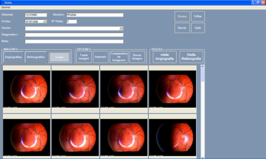 c. Pantalla de Visita. En esta podremos visionar las imágenes de la visita (Retinografía, Angiografías), comparar las imágenes de distintas visitas, tratar las imágenes, imprimir imágenes y realizar las distintas pruebas.